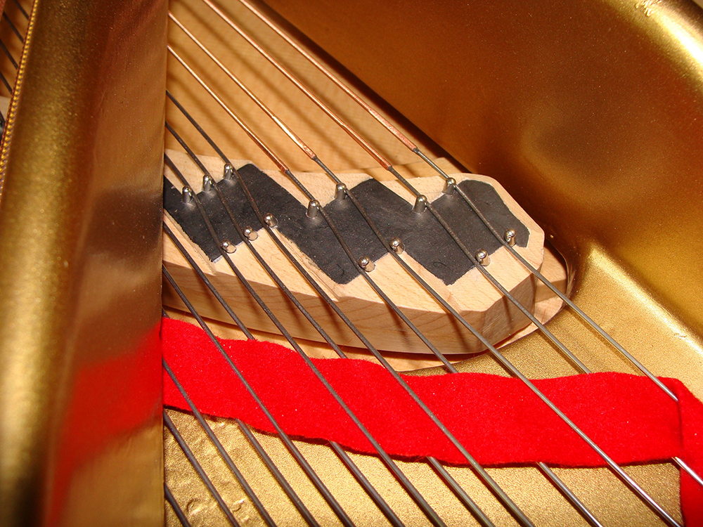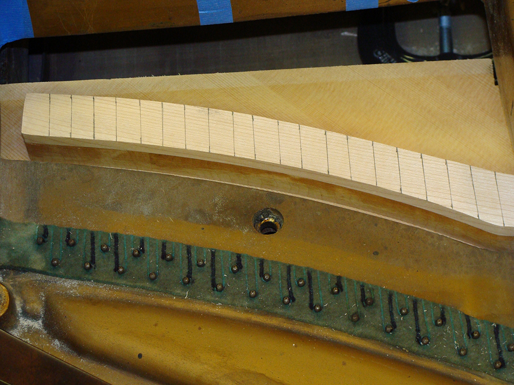 The finished bridge. This is the lower end of the treble bridge showing the addition of four bass strings (two notes). These notes were originally treble wire, but the bass strings give a better transition from bass to tenor.