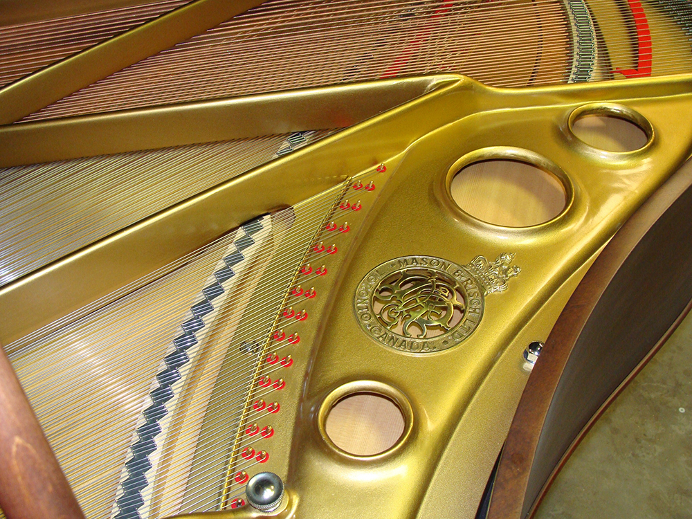 Mason and Risch was a company out of Toronto Canada. This is a view of the harp before and after restoration. This piano also received a new soundboard and bridge caps.